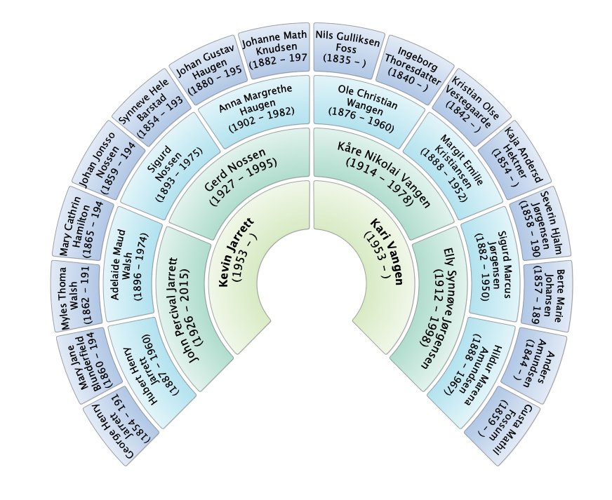 Dette er et oppslagspunkt for Karis og Kevins slekt. Jeg har laga fire trær, et hver for Karis mor (Amundsen/Jørgensen), Karis far (Kristiansen/Wangen), Kevins mor (Haugen/Nossen) og Kevins far (Walsh/Jarrett).