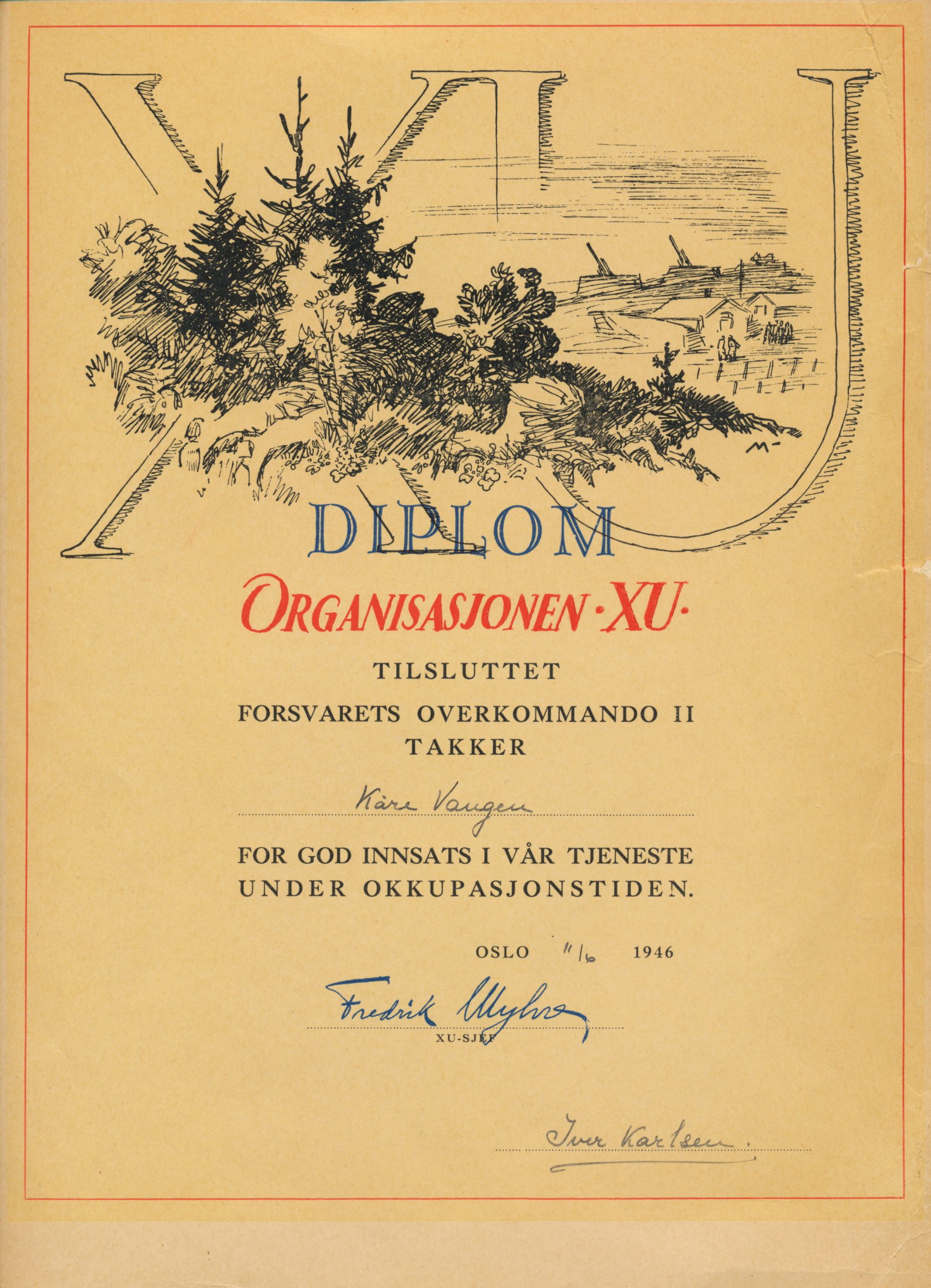 Kåre – Karis far – bidro under 2.verdenskrig med en innsats er omtalt i Einar og Svein Sæters bok om XU, og her kan du se diplom og attest fra Forsvarets Overkommando.